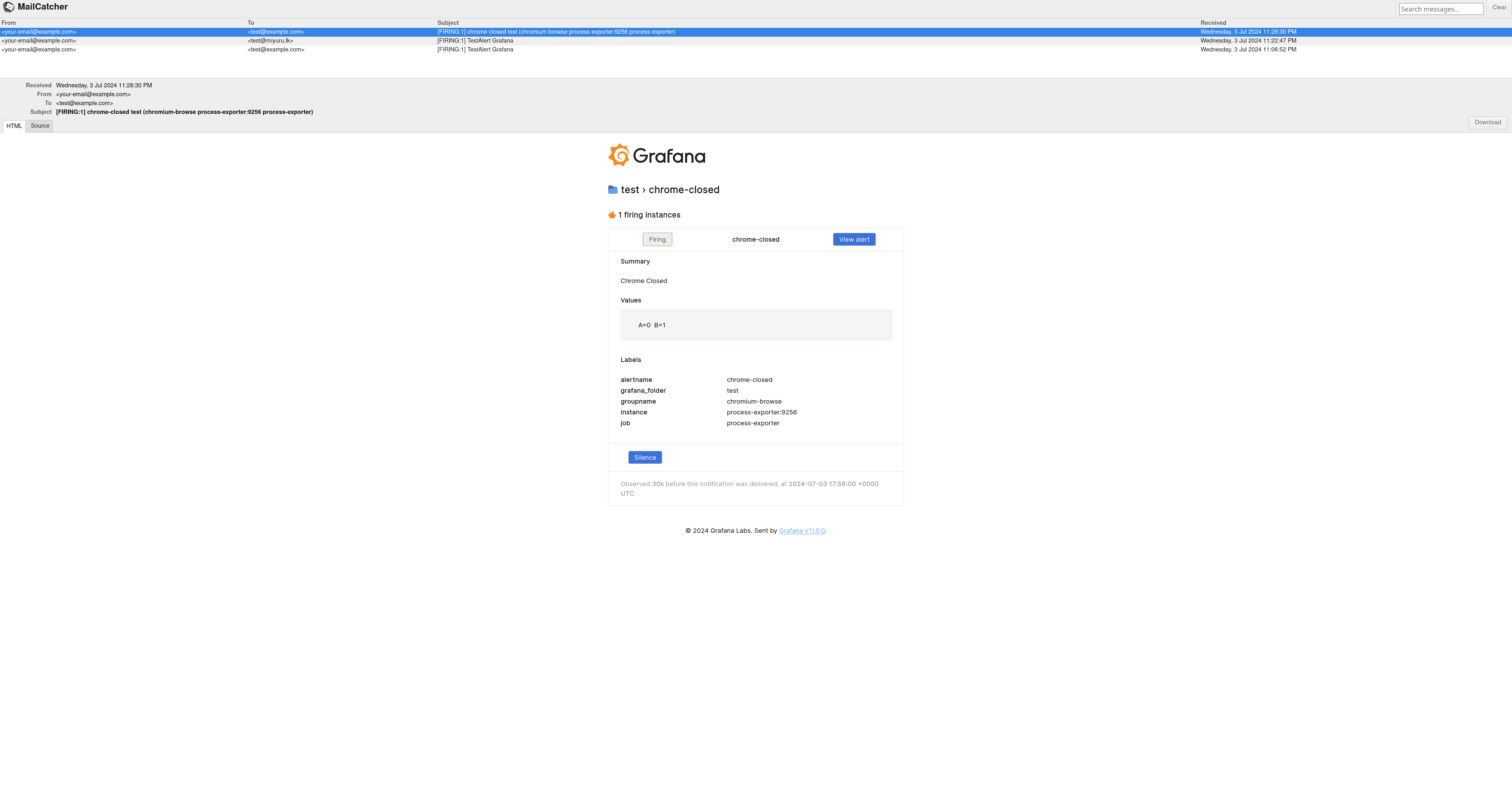 To test the email alerts, open your browser and go to http://localhost:1080 to access MailCatcher’s web interface.